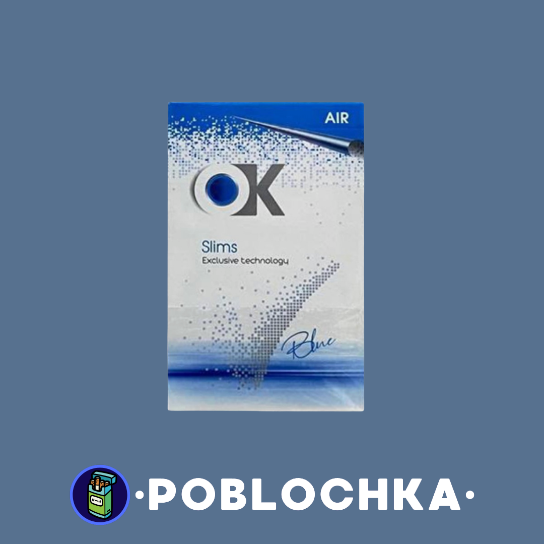 OK Super Slims Blue (ОК СС Синий) — тонкие сигареты Super Slims в стильном синем дизайне с технологией AIR (облегчённый поток воздуха для более мягкого курения). Лёгкой крепости (обычно 6 мг смолы, 0,5 мг никотина), мягкий и чистый табачный вкус. Без резкости — очень комфортное и лёгкое курение благодаря тонкому формату, качественному фильтру и технологии AIR. Идеальный выбор для тех, кто предпочитает элегантные тонкие сигареты с лёгким, утончённым вкусом в современном стильном оформлении — максимальная мягкость и элегантность в одной сигарете.